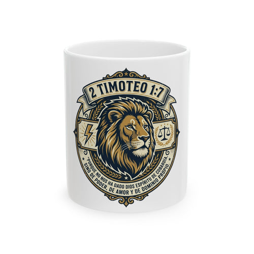2 Timoteo 1:7 Lion Ceramic Mug — Faith, Courage & Strength Bible Verse Coffee Cup (11oz/15oz)