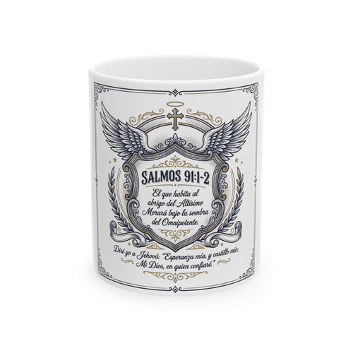 Ceramic Mug - Salmos 91:1-2 Spanish Scripture Coffee Cup with Winged Crest (11oz/15oz)